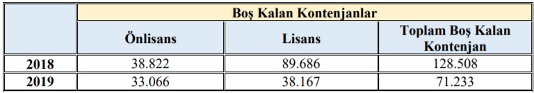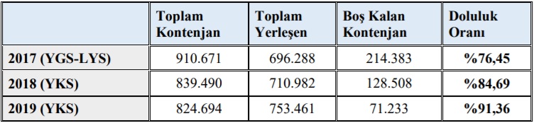 2018 yılında toplam kontenjanın %15.3’ü boş kalmış iken, 2019 yılında bu oran %8.63’e düşürülmüştür. 2018 yılında lisans programlarında 89.686 kontenjana yerleşme olmamıştır. Bu boş kalan kontenjanların 58.107’si Devlet, 23.531’i Vakıf, 7.205 KKTC Üniversiteleri, 843’ü ise diğer ülkelerdeki üniversitelere aittir. 2019 yılında lisans programlarında boş kalan kontenjan sayısı daha da azalmış ve lisans programlarında boş kalan kontenjan sayısı 38.167 olmuştur. Bu boş kalan kontenjanların 20.866’sı Devlet, 12.564’ü Vakıf, 4.120 KKTC Üniversiteleri, 617’si ise diğer ülkelerdeki üniversitelere aittir. Lisans programlarının kontenjanlarının belirlenme sürecinde yapılan başarılı değerlendirmeler sonucu boş kalan kontenjanların sayısı geçen seneye göre 51.519 azalmıştır.