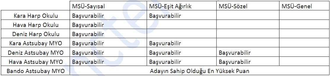 Not: Aday (Öğrenci) istediği kadar harp okulu ve astsubay okulu başvurusu yapabilir. Askeri okullara başvuran adaylar diğer sınavlara ve tercihlere başvurabilir (Özel yetenek, merkezi tercihler vb.)