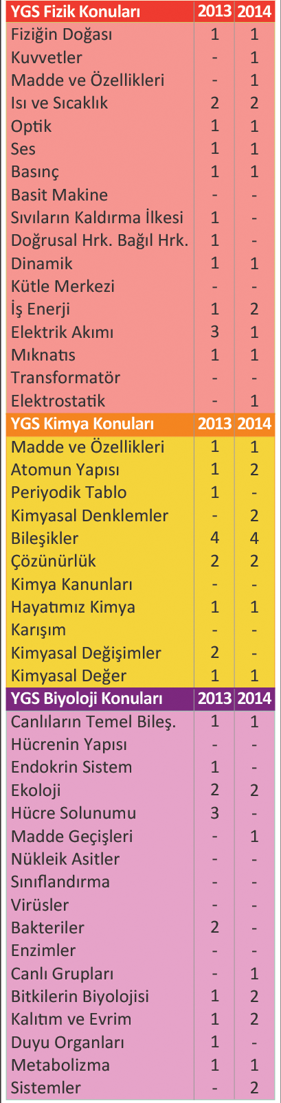 YGS 2013-2014 FİZİK, KİMYA, BİYOLOJİ SORU-KONU DAĞILIMI