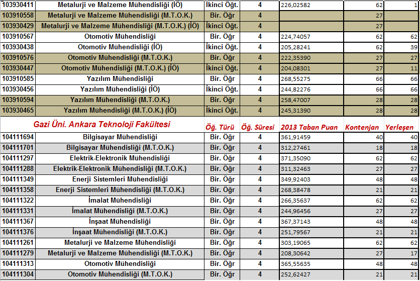 Not: ÖSYM bölümlerin 2013 sıralamasını henüz açıklamamıştır. Bölümlerin sıralamaları açıklandığında buraya eklenecektir. Adayların M.T.O.K. mühendislikleri ile normal mühendislikleri puan olarak kıyaslayabilmeleri için, Teknoloji fakültelerindeki iki mühendislik türününde bilgileri ve puanları verilmiştir.